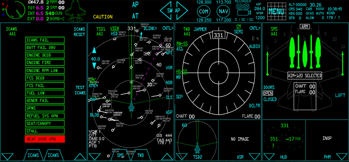 Fully physical fighter jet cockpit (rotaries and switches), network ready for multi-pilot engagements. Based on "superbug" - faithful software reproduction of the US Navy's FA-18 fighter. Reflecting all major F-18 features, functional tactical weapons and sensors, accurate radar, navigation systems, dedicated fuel, hydraulic, electrical and ECS simulations, based on the US Navy's Natops flight manuals for the aircraft