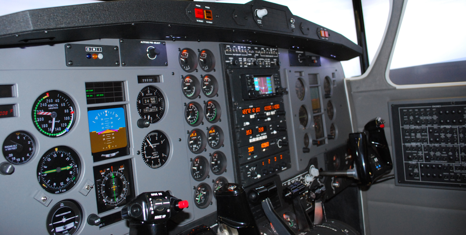 The MFD Turboprop represents a modern King Air type flight deck with EFIS (Electronic Flight Instrument System) type displays. The system has more new standard features including audio panel with digital altitude pre-select, autopilot, flight director, panel backlighting, circuit breaker panel, overhead panel with speakers and map lights, avionics stack that supports up to two Garmin GNS 430s or GNS 530s, four-way intercom and an all new center flight console giving you well more features than any other AATD on the market today.